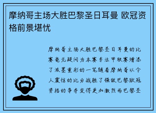 摩纳哥主场大胜巴黎圣日耳曼的比赛,毫无疑问为本赛季法甲联赛增添了浓墨重彩的一笔。随着摩纳哥以令人震惊的比分战胜了强敌巴黎,欧冠资格的争夺变得更加激烈,而巴黎圣日耳曼的欧冠资格前景开始变得堪忧。这场比赛...