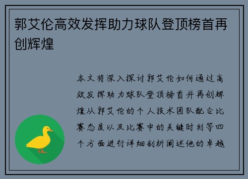 本文将深入探讨郭艾伦如何通过高效发挥,助力球队登顶榜首并再创辉煌。从郭艾伦的个人技术、团队配合、比赛态度、以及比赛中的关键时刻等四个方面进行详细剖析,阐述他的卓越表现如何为球队的成功奠定基础。郭艾伦凭...