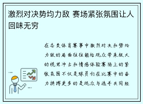 在各类体育赛事中,激烈对决和势均力敌的局面往往能给观众带来极大的视觉冲击和情感体验。赛场上的紧张氛围,不仅是球员们在比赛中的奋力拼搏,更多的是观众与选手共同经历的那种悬念与刺激。无论是足球、篮球还是网...