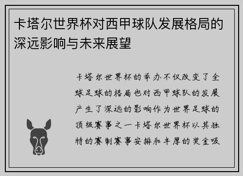 卡塔尔世界杯的举办不仅改变了全球足球的格局,也对西甲球队的发展产生了深远的影响。作为世界足球的顶级赛事之一,卡塔尔世界杯以其独特的赛制、赛事安排和丰厚的奖金吸引了世界各地的顶级球员和教练,而这些变化在...