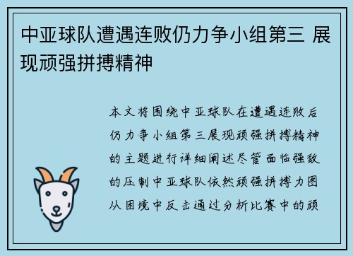 本文将围绕中亚球队在遭遇连败后仍力争小组第三、展现顽强拼搏精神的主题进行详细阐述。尽管面临强敌的压制,中亚球队依然顽强拼搏,力图从困境中反击。通过分析比赛中的顽强精神、战术调整、球员心理素质以及球队文...