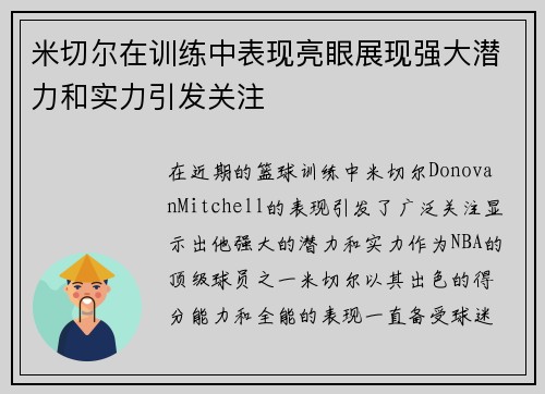 在近期的篮球训练中,米切尔(Donovan Mitchell)的表现引发了广泛关注,显示出他强大的潜力和实力。作为NBA的顶级球员之一,米切尔以其出色的得分能力和全能的表现一直备受球迷和媒体的关注。通...