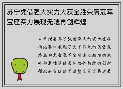 文章摘要:苏宁凭借强大的实力,在各项比赛中展现了无可匹敌的优势,最终成功荣膺冠军宝座。通过精准的战略部署、精湛的团队协作、持续的创新驱动和高效的资源整合,苏宁再次展示了自己的卓越水平。本篇文章将从这四...