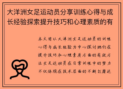 本文将以大洋洲女足运动员的训练心得与成长经验为中心,探讨她们在提升技巧和心理素质方面的有效方法。女足运动员在日常训练中的努力,不仅体现在技术层面的不断打磨,还涉及到心理素质的提升。通过运动员的个人经历...